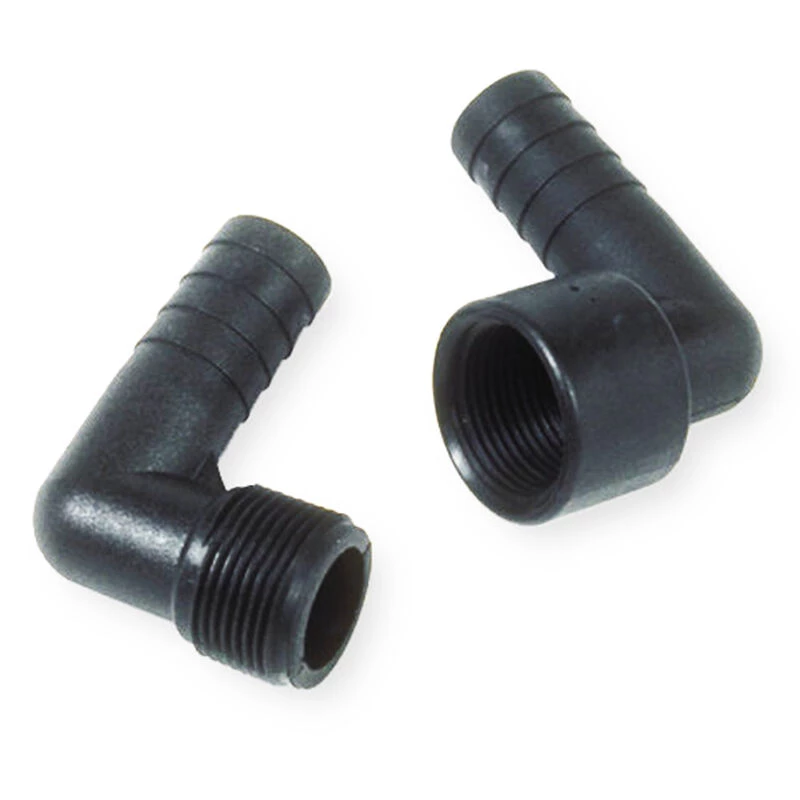 Marelon 90° Elbows feature hose barbs on one end (size given as inside diameter or ID) and either female NPS threads or male NPS threads on the other end. Threads are parallel “NPS,” which stands for “Nominal Pipe Size.”