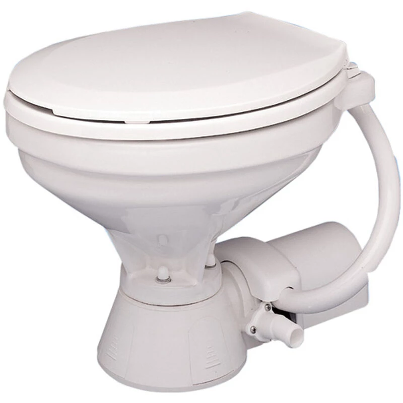 A dual-function pump eliminates the need for hand pumps and dry-bowl valves. With the push of a button, the self-priming flexible impeller flush pump rinses the bowl as the macerator and high-capacity scavenger pump grinds up waste and pumps it out. Has a built-in back flow preventer. Uses a permanent magnet type motor, fully enclosed, with stainless steel shaft. Includes a heavy-duty pushbutton and 1″ to 1-1/2″ discharge hose adapter. Easy-to-clean china bowl.