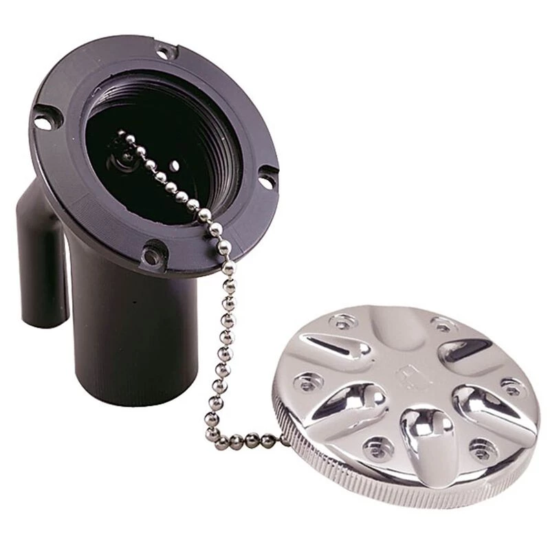 The PERKO Vented Water Fill for 1 1/2″ Hose with Angled Neck features a black polymer body with a chrome plated bronze cap that is marked with a water symbol. Also includes a stainless steel bead chain to retain cap.
