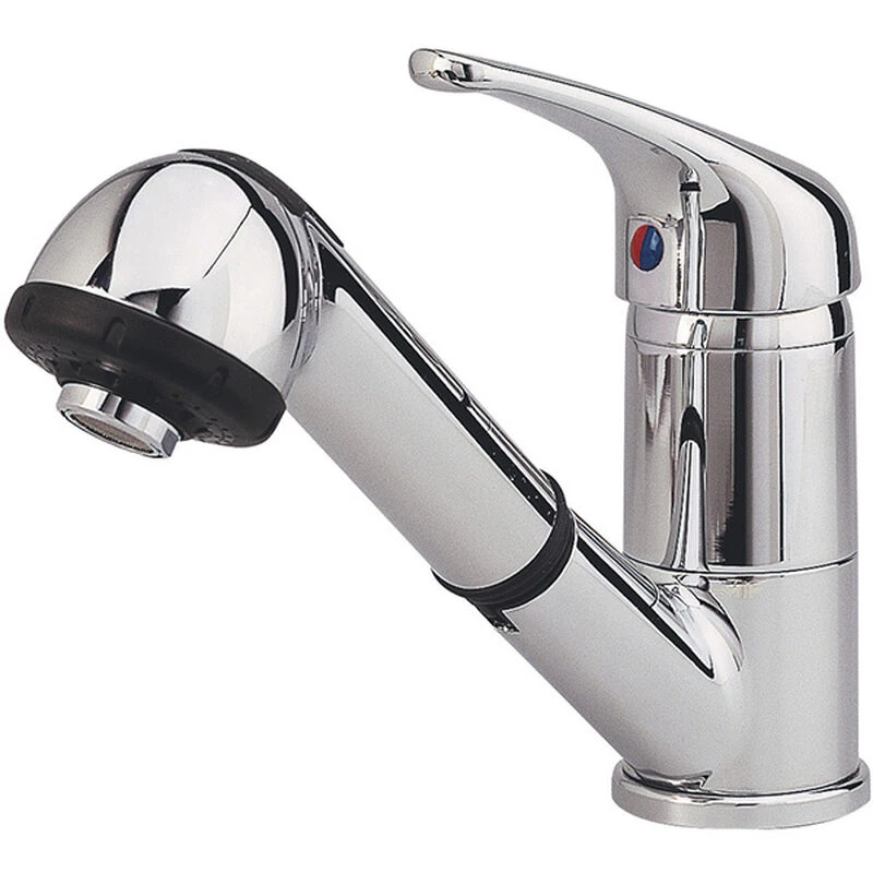 The Plastimo Chrome Mixer Faucet that comes with a shower head. Can be used as a shower or as a basic tap. Shower comes with a 4.9′ flexible hose and a swiveling shower base. Also comes with 2 metal 13-1/2″ flexible hoses with screw-type connectors. This compact unit features quality components and a pull-out design. Features your choice of spray or stream settings. Sturdy chromed brass construction.