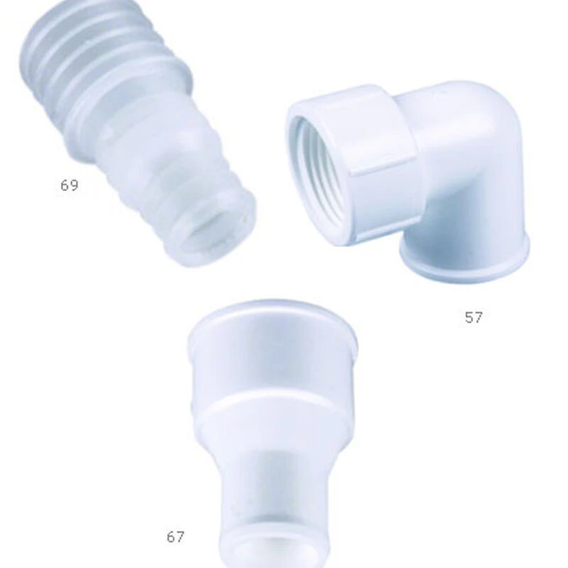 Use 90° elbow adapters for rigid pipe installations of sump and utility pumps. The adapters snap onto the discharge port without the need for a hose clamp.