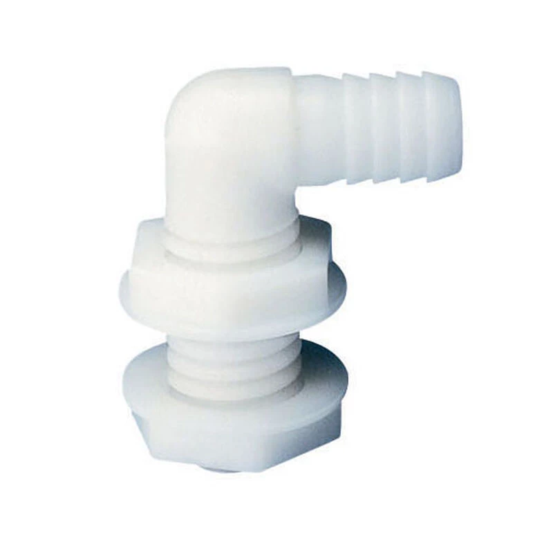 Plastic plumbing fittings like these 90° Plastic Mushroom Head Barbed Thru-Hull Fittings cost less than similar fittings made of Marelon or Bronze, but are for above-the-waterline use only. Possible uses include sink, scupper and bilge pump overboard discharge.