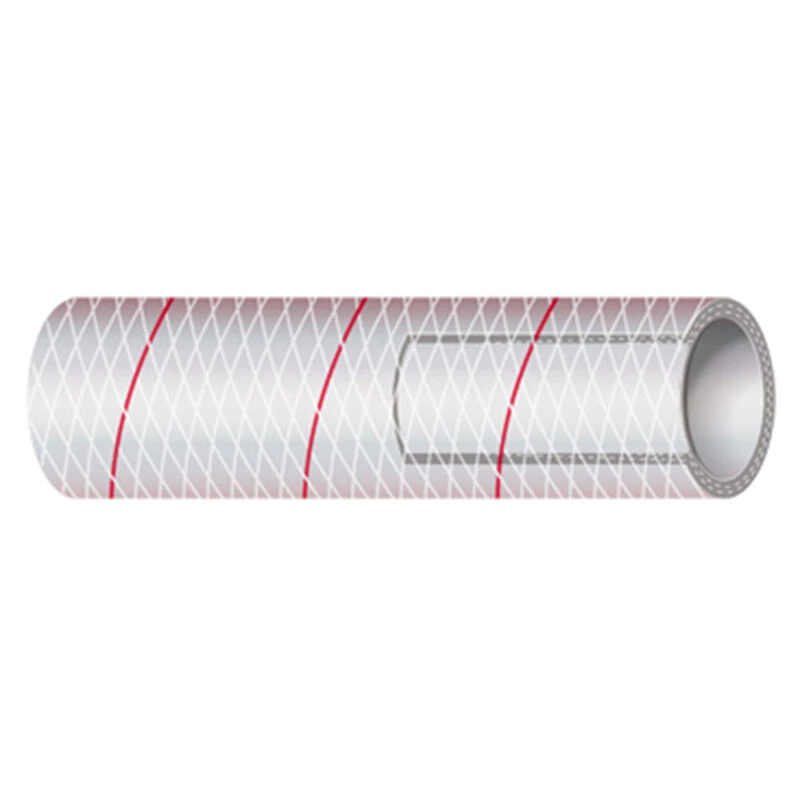 SHIELDS RUBBER Reinforced PVC All Clear with Red Tracer tubing has a heavy wall FDA formula vinyl, polyester braid reinforcement, and 250psi burst pressure. This hose is primarily used for pressurized water system supply (hot or cold), drain lines (sink, shower, icebox), wash down pump connections and head intake.