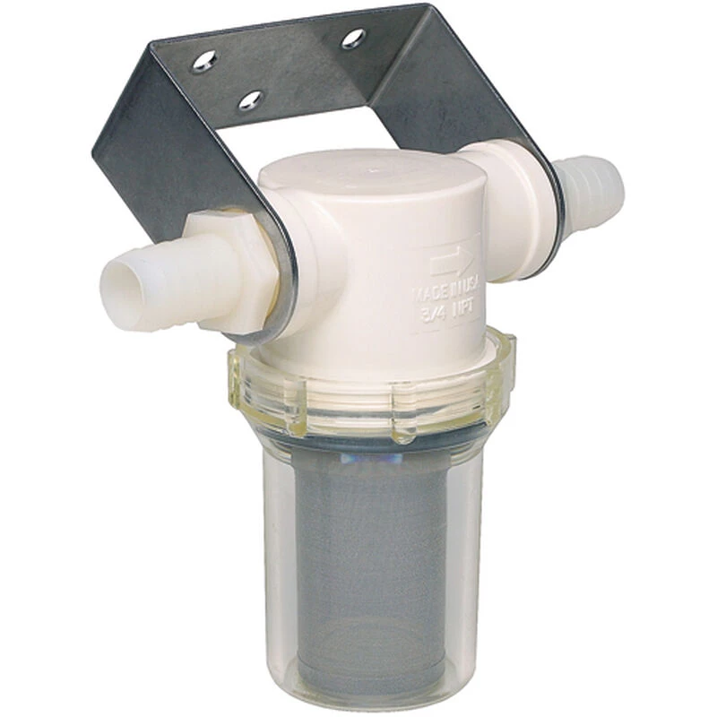 Debris is the kryptonite to small marine pumps. Abrasive particles from raw water sources can damage impellor fins, scratch the housing and reduce the pump’s efficiency. Shurflo designed these strainers as a line of defense. Their high capacity keeps water flowing while removing debris that can foul pumps. A clear Polyamide bowl allows users to visually inspect the strainer or twist it off without tools to clean or replace the mesh screen. An included mount can be secured to a bulkhead using pan head screws. Four port sizes are available to match most applications. The 1/2″ model is available with or without the mounting bracket. Replacement strainer screens are available.